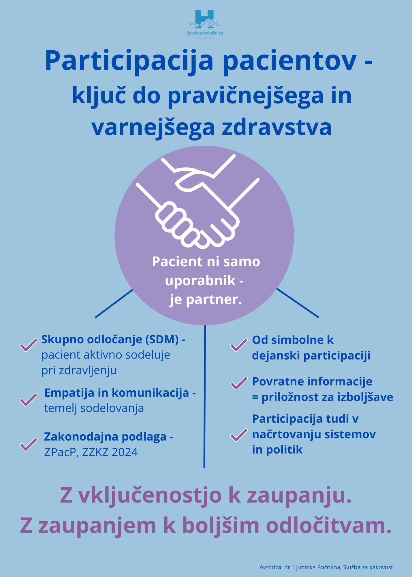 Dr. Ljubinka Počrvina, vodja Službe za kakovost in predsednica Komisije za kakovost in varnost ter pobudnica modela sodelovanja, ob tem izpostavlja, da pacient ni zgolj uporabnik zdravstvenih storitev, temveč je partner v procesu obravnave. Odprt dialog po njenem mnenju vodi do boljših odločitev, vključevanje pacientov pa pomembno krepi zaupanje in varnost.