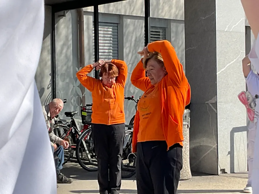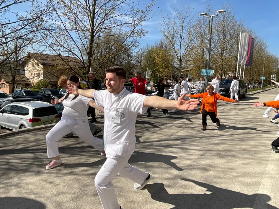 »1000 gibov« za vsakega posameznika. Inštruktorica društva nam je pred vhodom v bolnišnico pokazala vaje, ki jih vsako jutro izvajajo udeleženci vadbe, danes pa so jih izvajali mimoidoči, udeleženci stojnic in vodstvo bolnišnice.